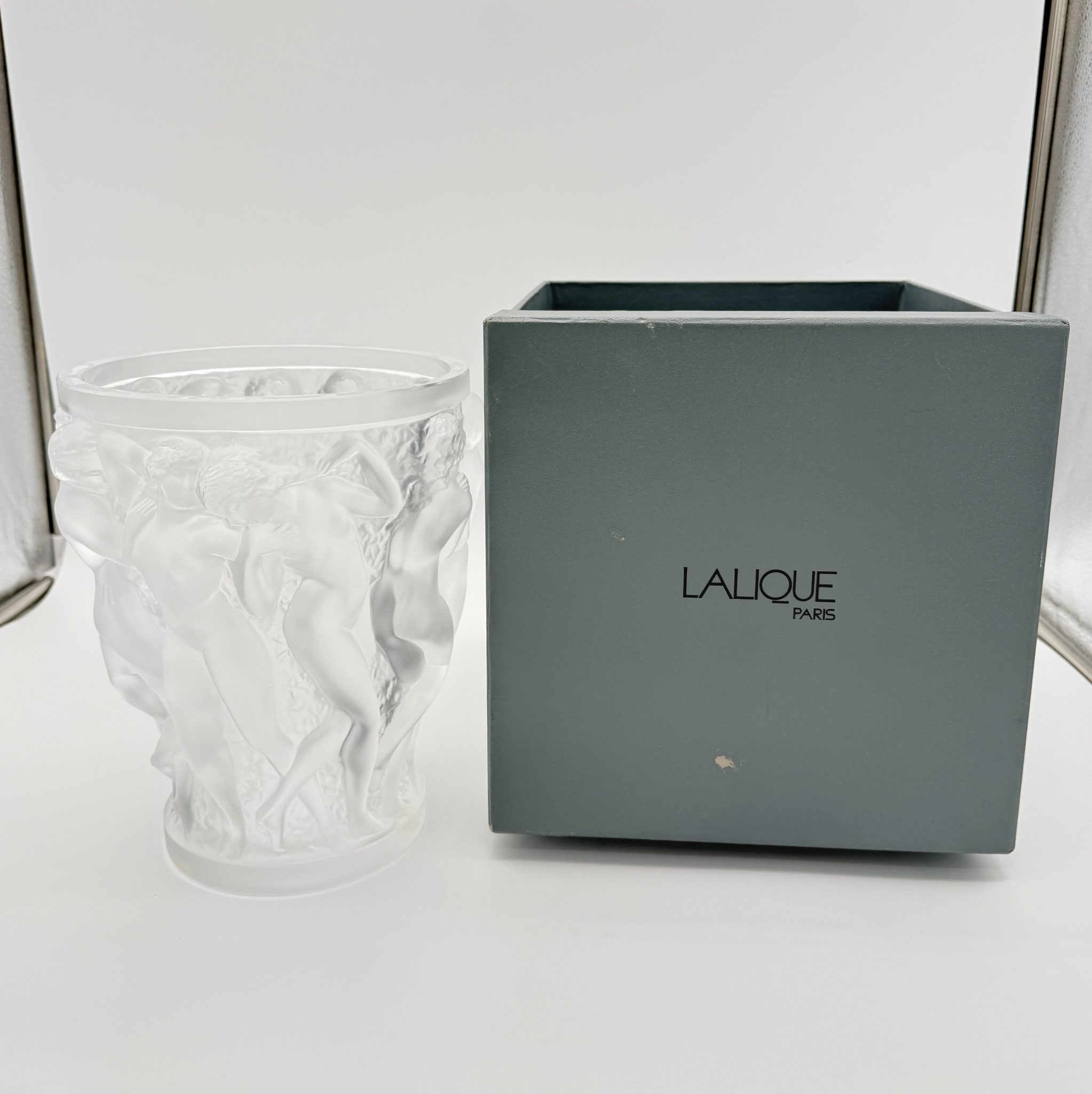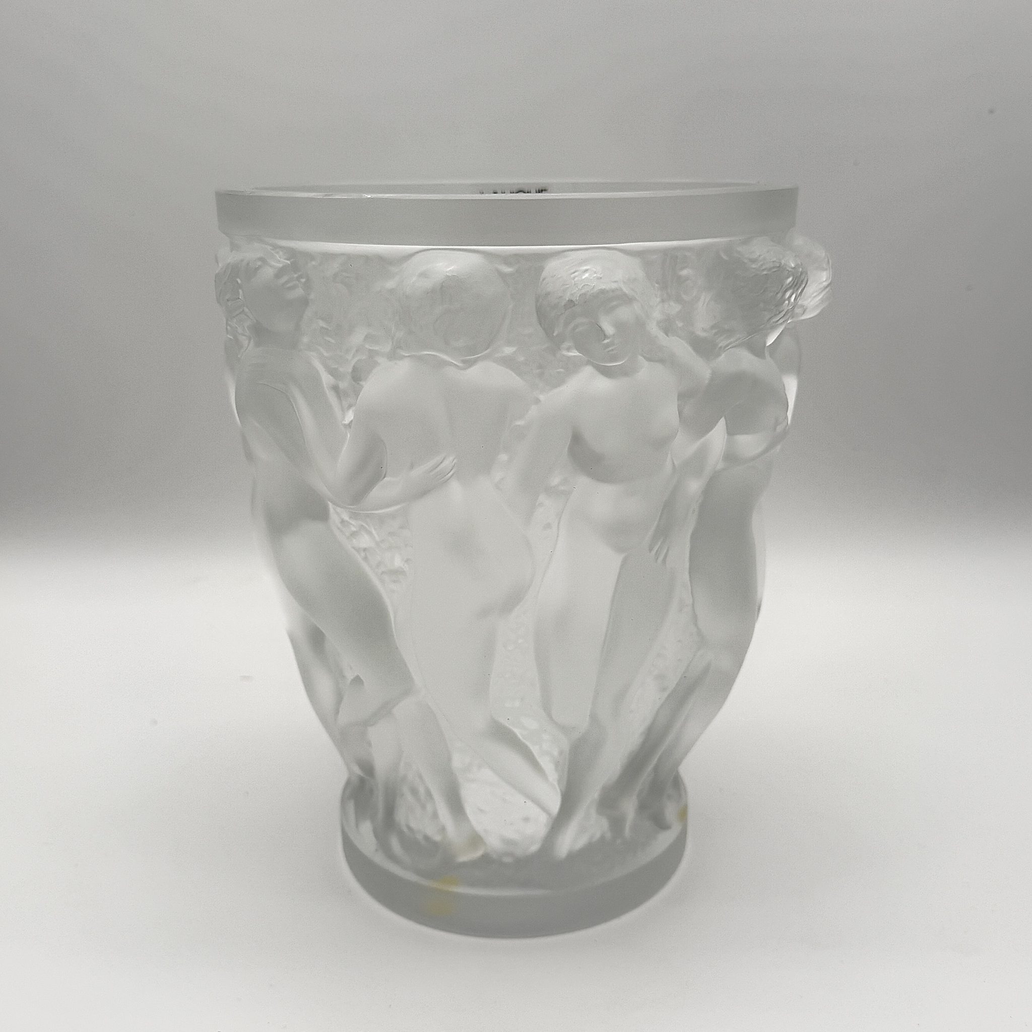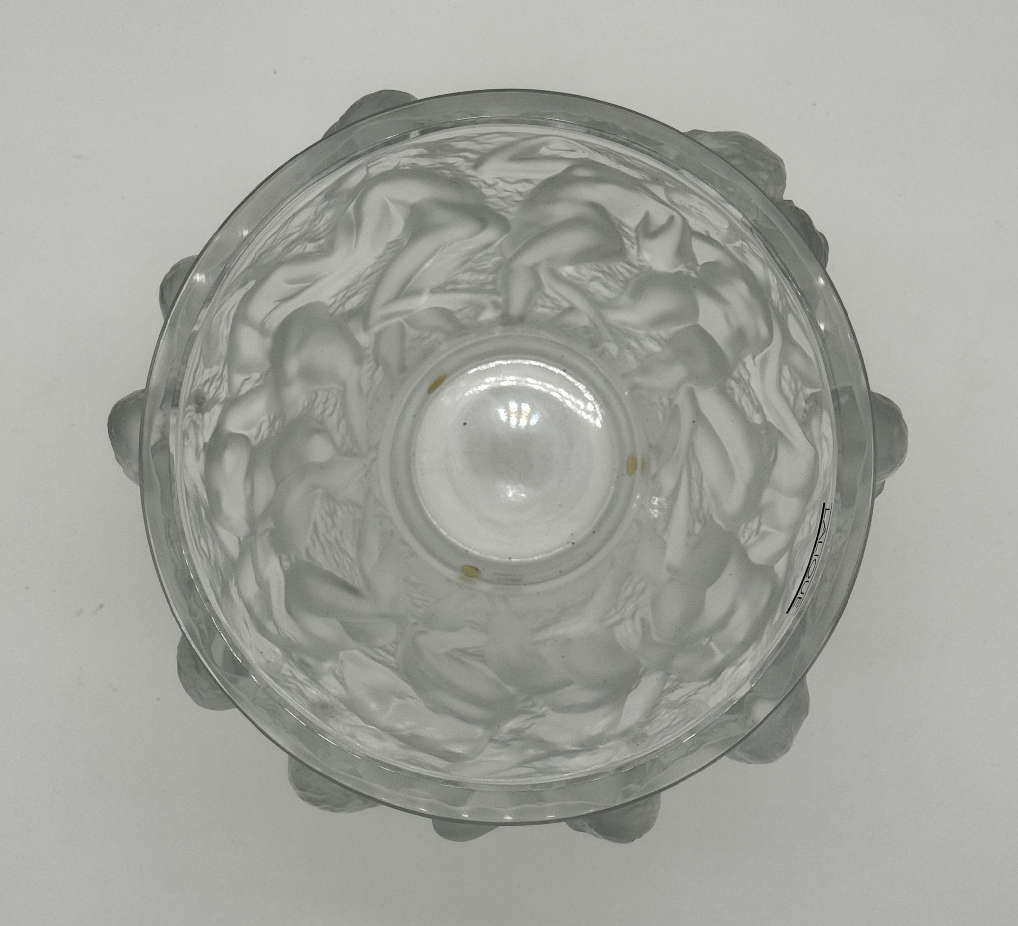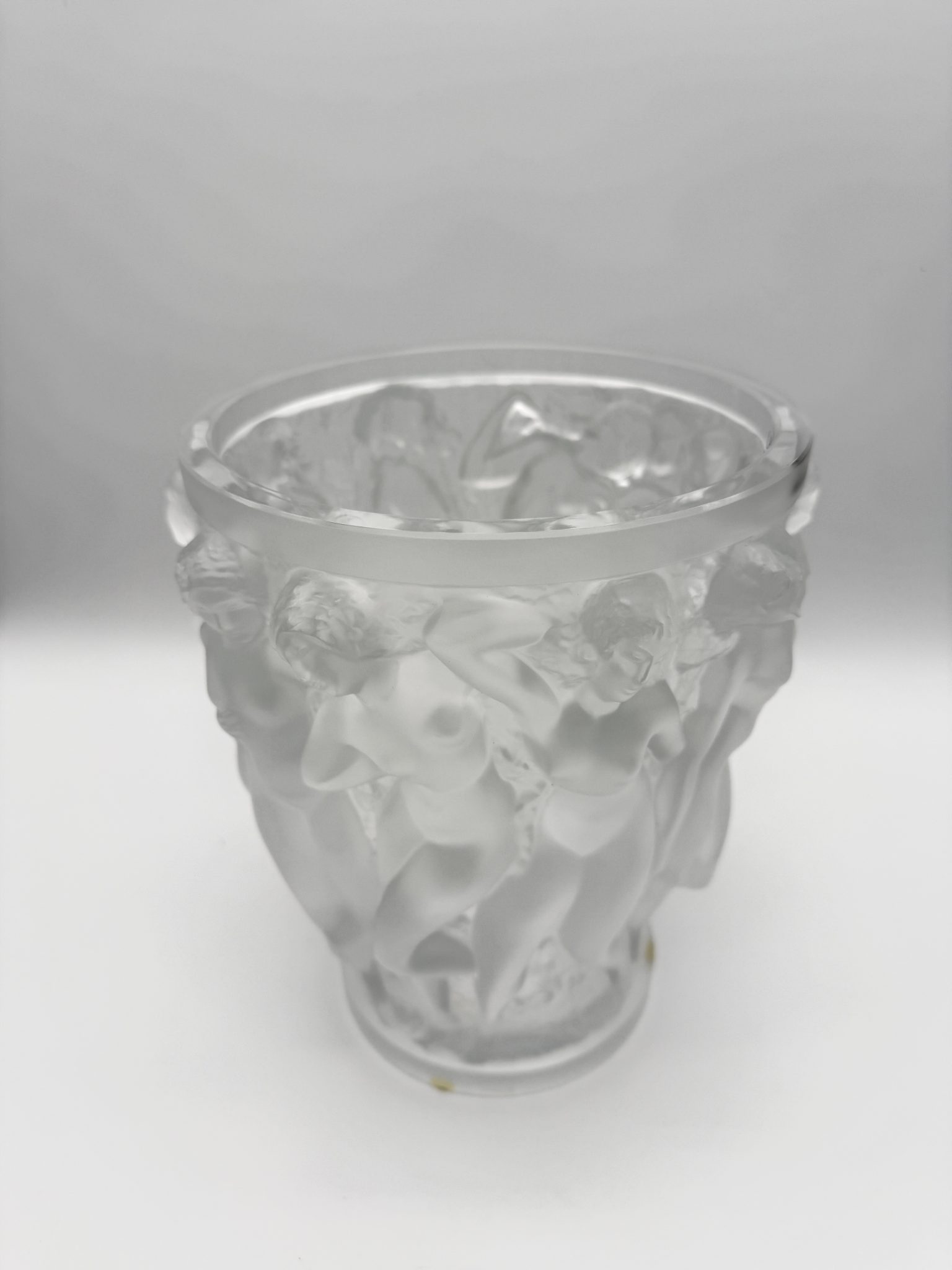 René Lalique entwarf die „Bacchantes“ 1927 – sie gehört zu seinen berühmtesten Glasobjekten und zeigt die für die 1920er typische Verbindung aus Klassizismus und Art Déco. Das Modell wurde später von Lalique France weiterproduziert und gilt bis heute als Ikone der Manufaktur. Sammler schätzen besonders frühe Ausführungen und gut erhaltene satinierte Stücke.