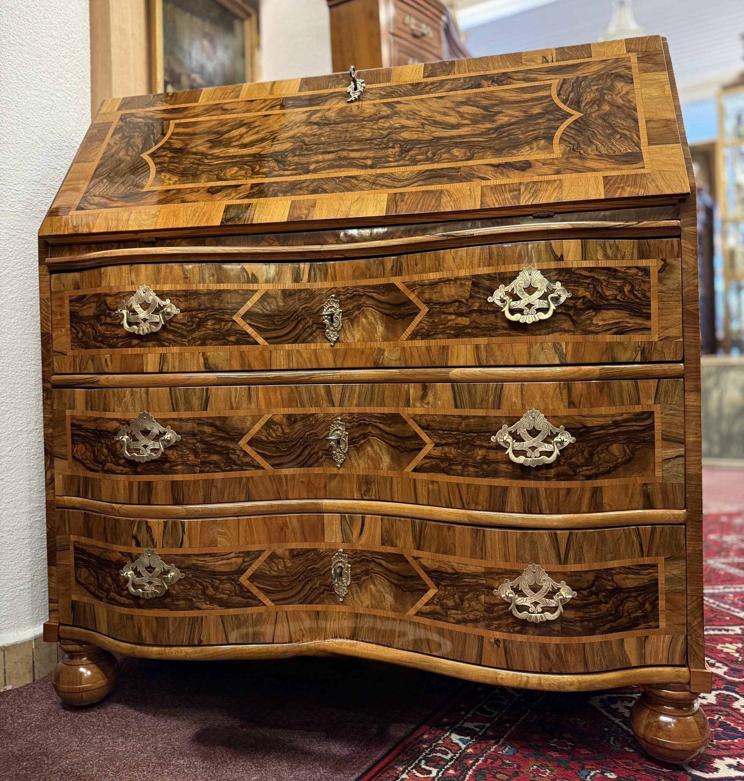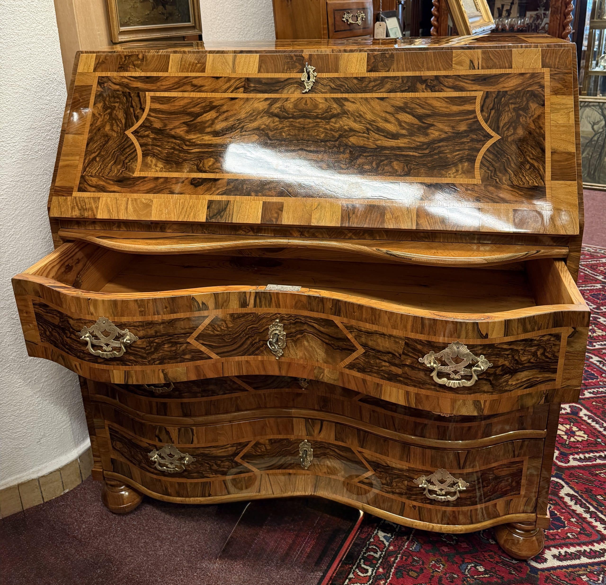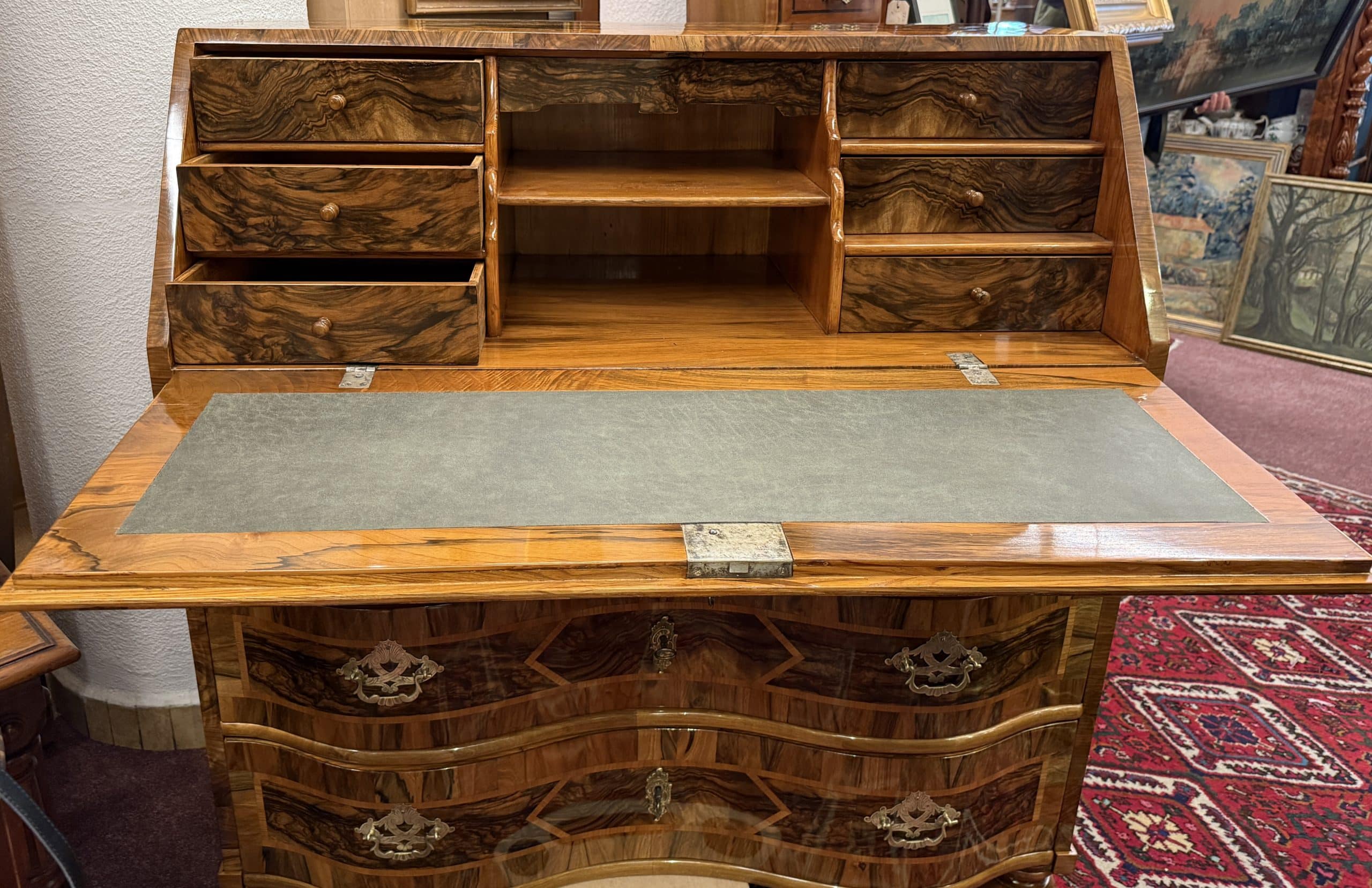 Professionell restaurierter Barocksekretär mit erneuerter Rückwand. Drei große Schubfächer außen, innen links und rechts je drei kleine sowie ein zentrales Fach. Edles Furnierbild und geschweifte Front.