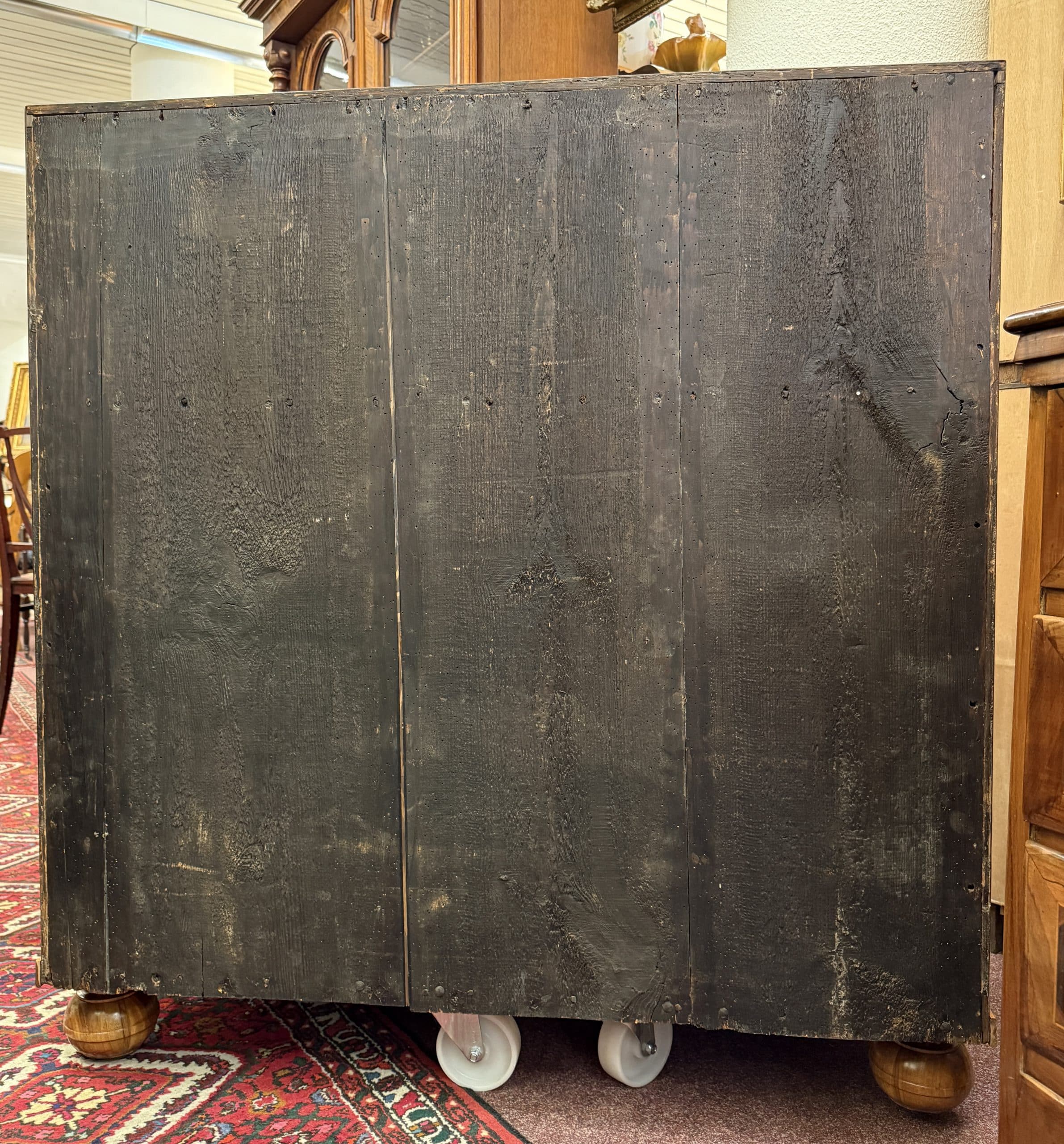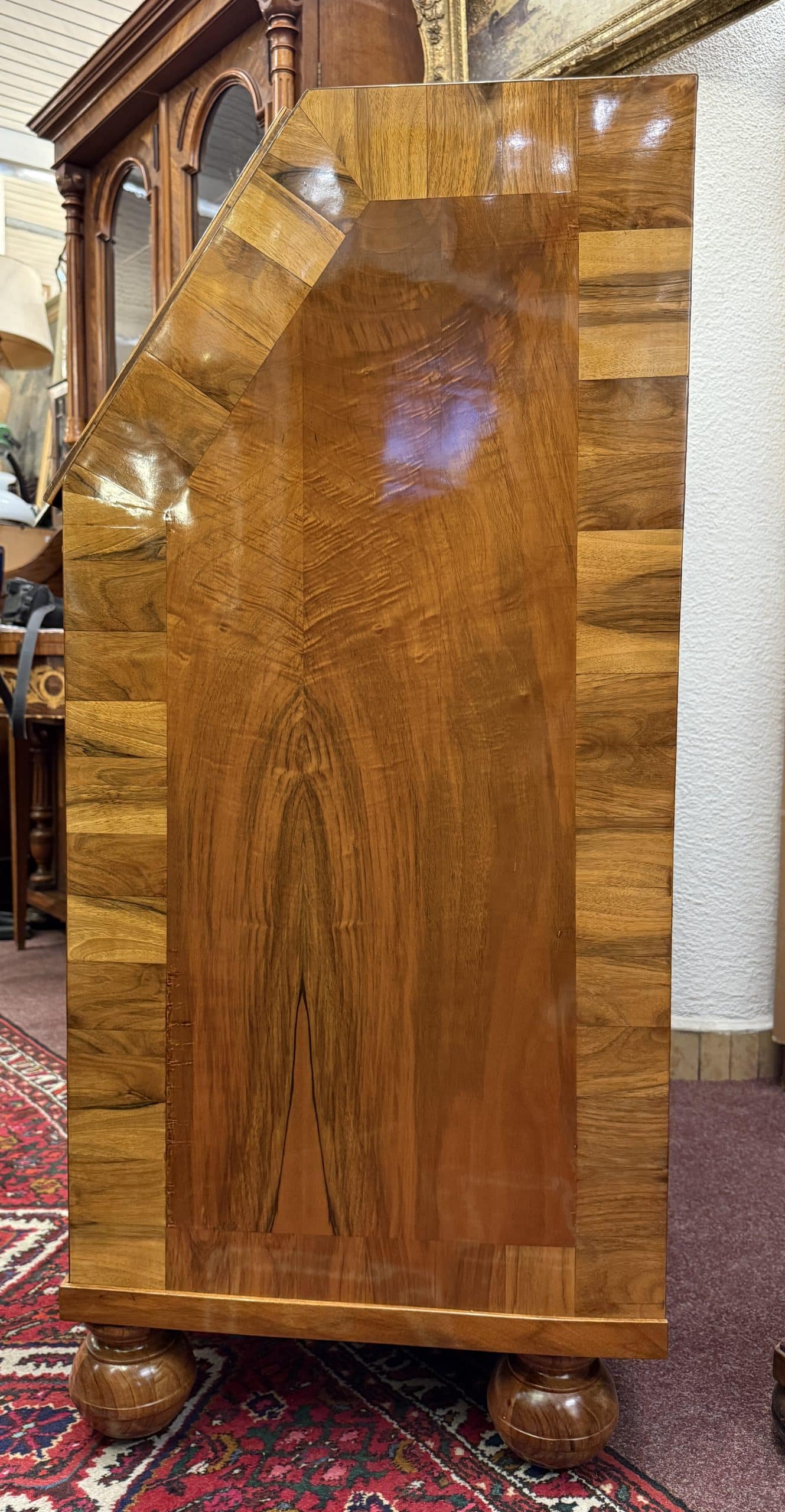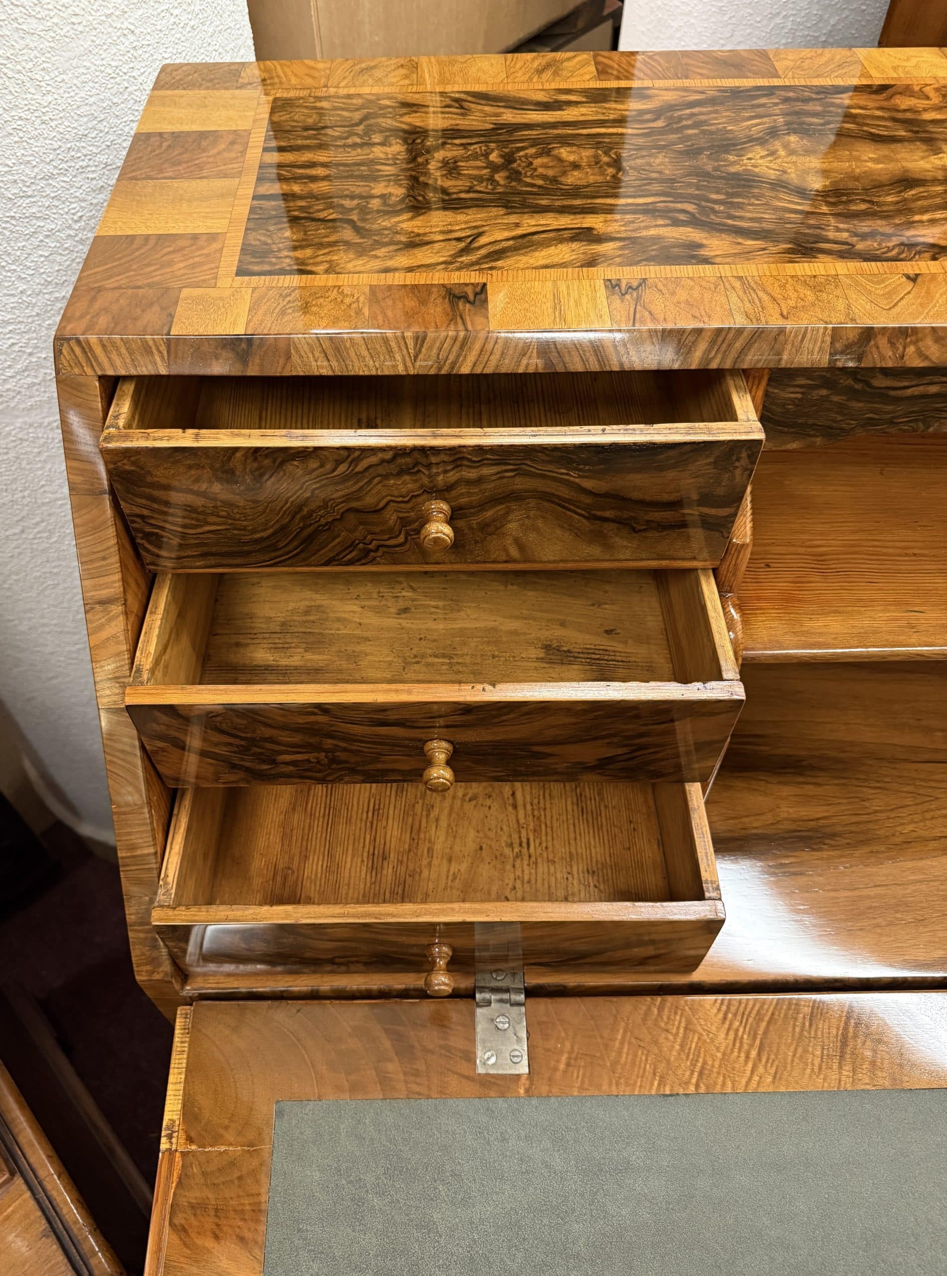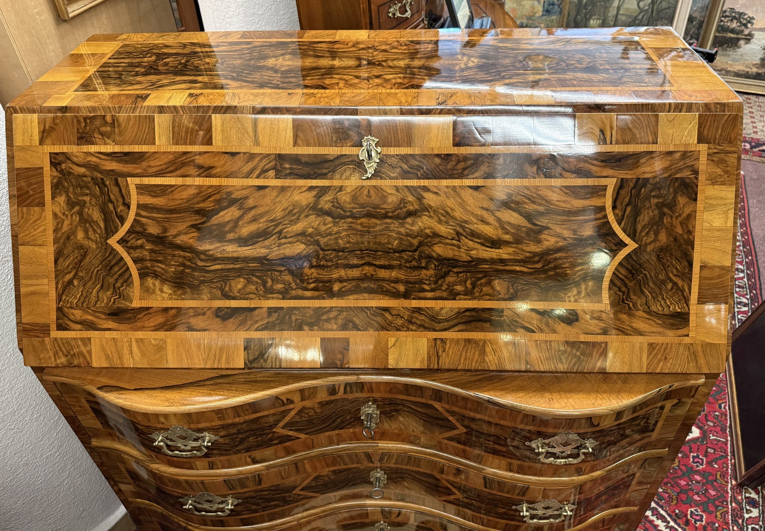 Professionell restaurierter Barocksekretär mit erneuerter Rückwand. Drei große Schubfächer außen, innen links und rechts je drei kleine sowie ein zentrales Fach. Edles Furnierbild und geschweifte Front.