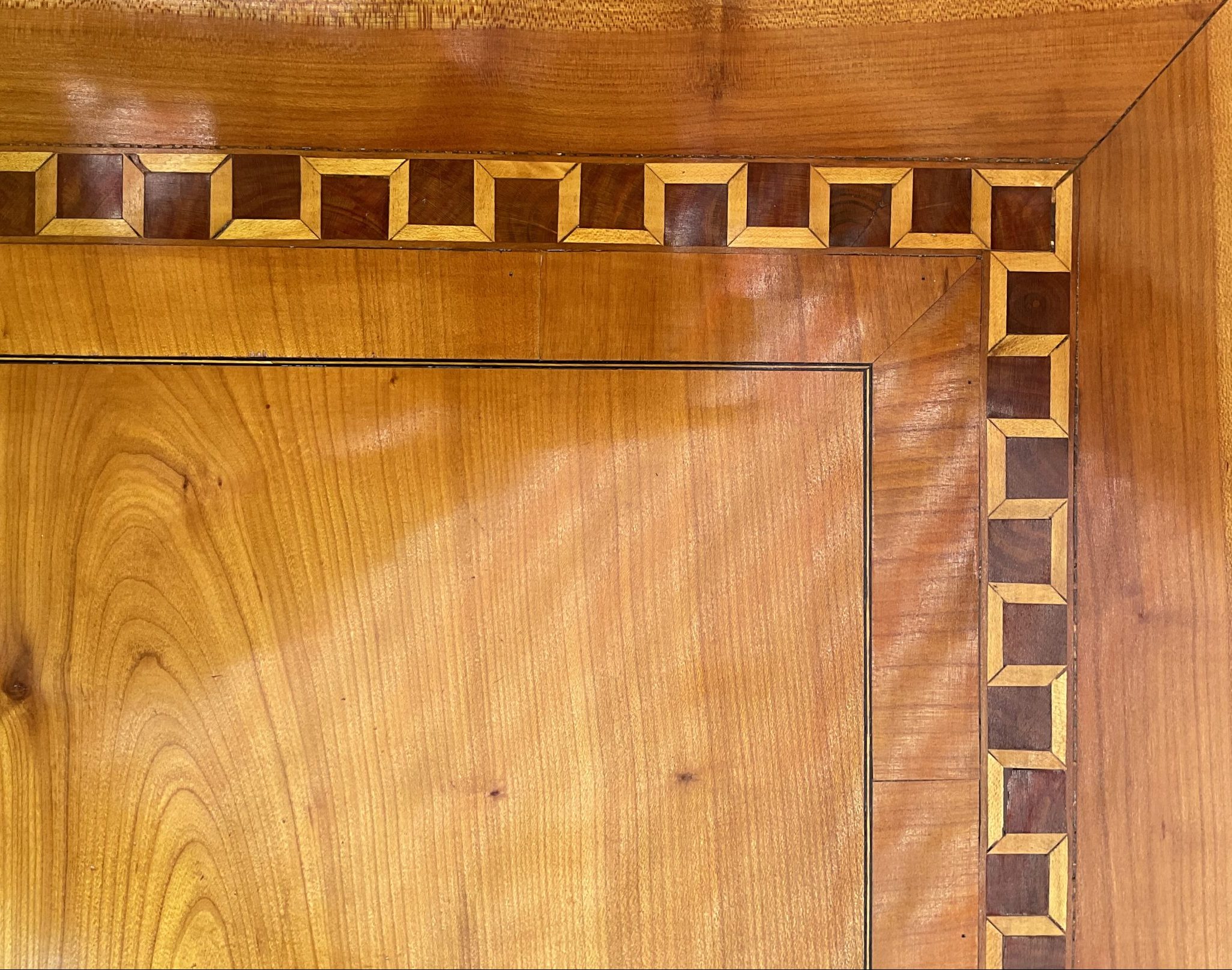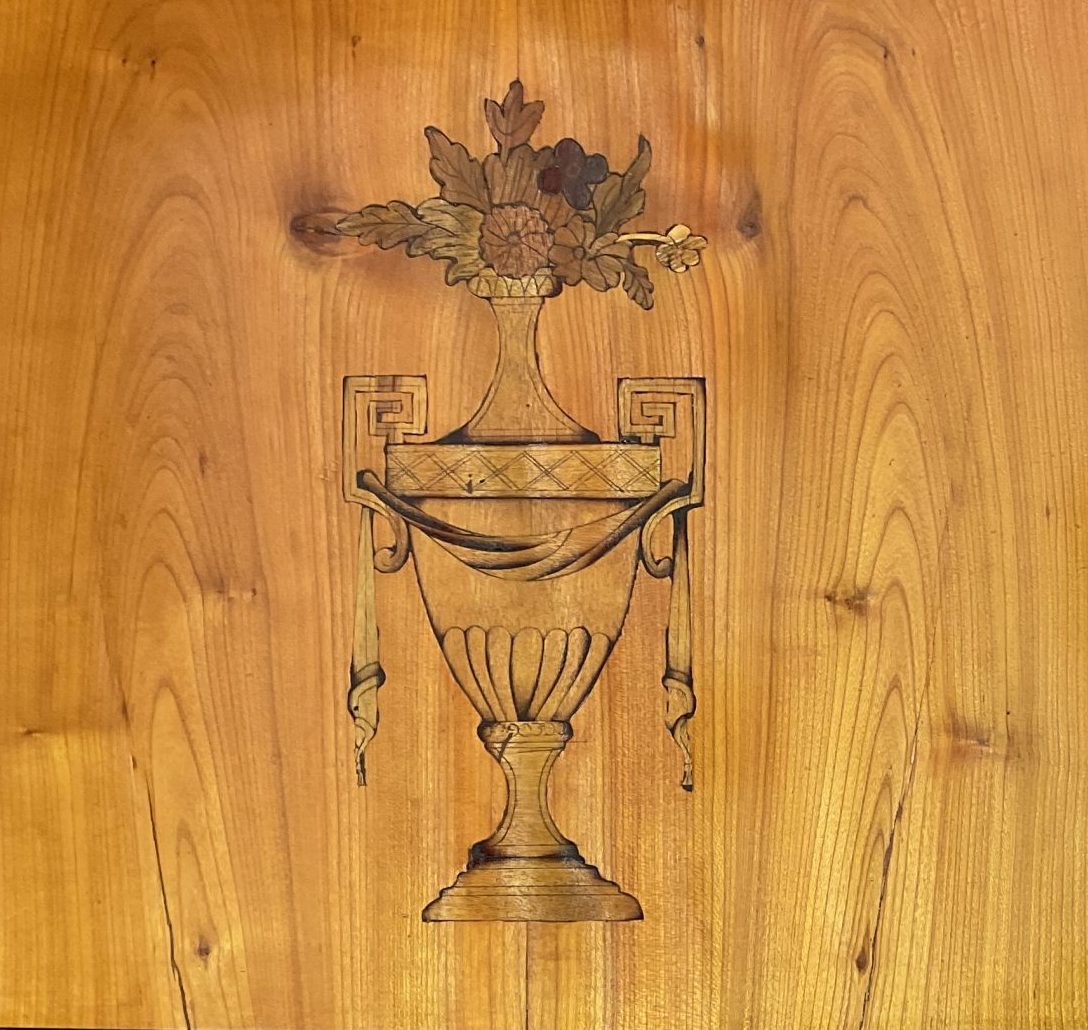 Material: Kirschholzfurnier, Nussholzfurnier, Birke, Marketerie aus verschiedenen Hölzern