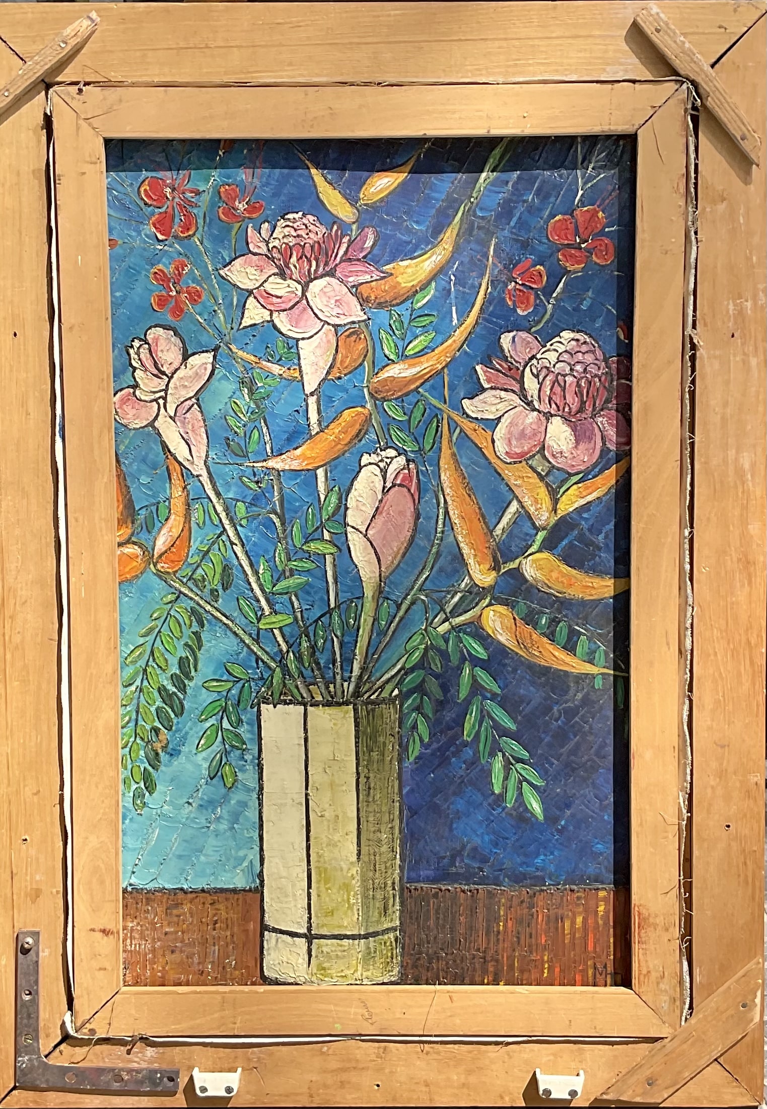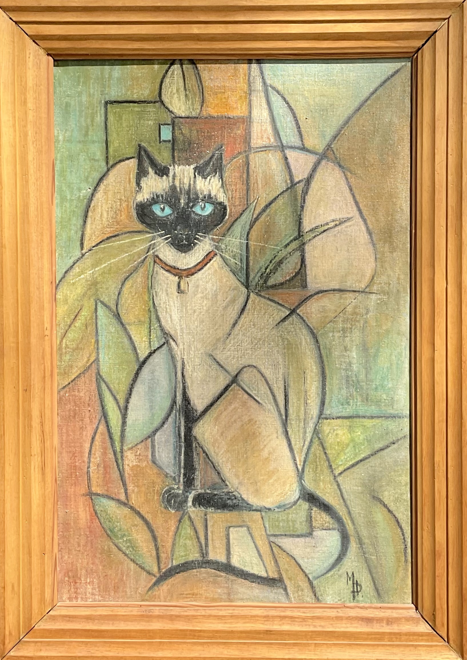 der Künstler (Signatur „M P/D“ beidseitig vorhanden) hat, wie Maler es oft tun, Vorder- sowie Rückseite komplett bemalt. Vorne sieht man eine hübsch stilisierte Siamkatze in Pastelltönen und hinten ein expressives Stillleben in handwerklich gekonnt pastoser Spachteltechnik gearbeitet. Durch die lebendige Farbgebung mutet das Stilleben fast wie ein Glasmosaik/Kirchenfenster an. Zu schade um es zu verstecken!