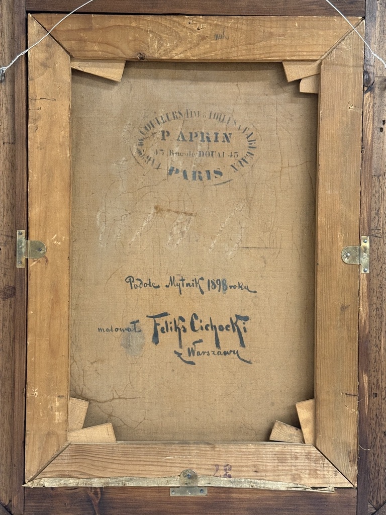 Rückseite: ovaler Stempel des Malerbedarfsgeschäfts von P. Aprin in Paris; darunter: „Podole Mytnik 1898“ | gemalt von Feliks Cichocki | aus Warschau