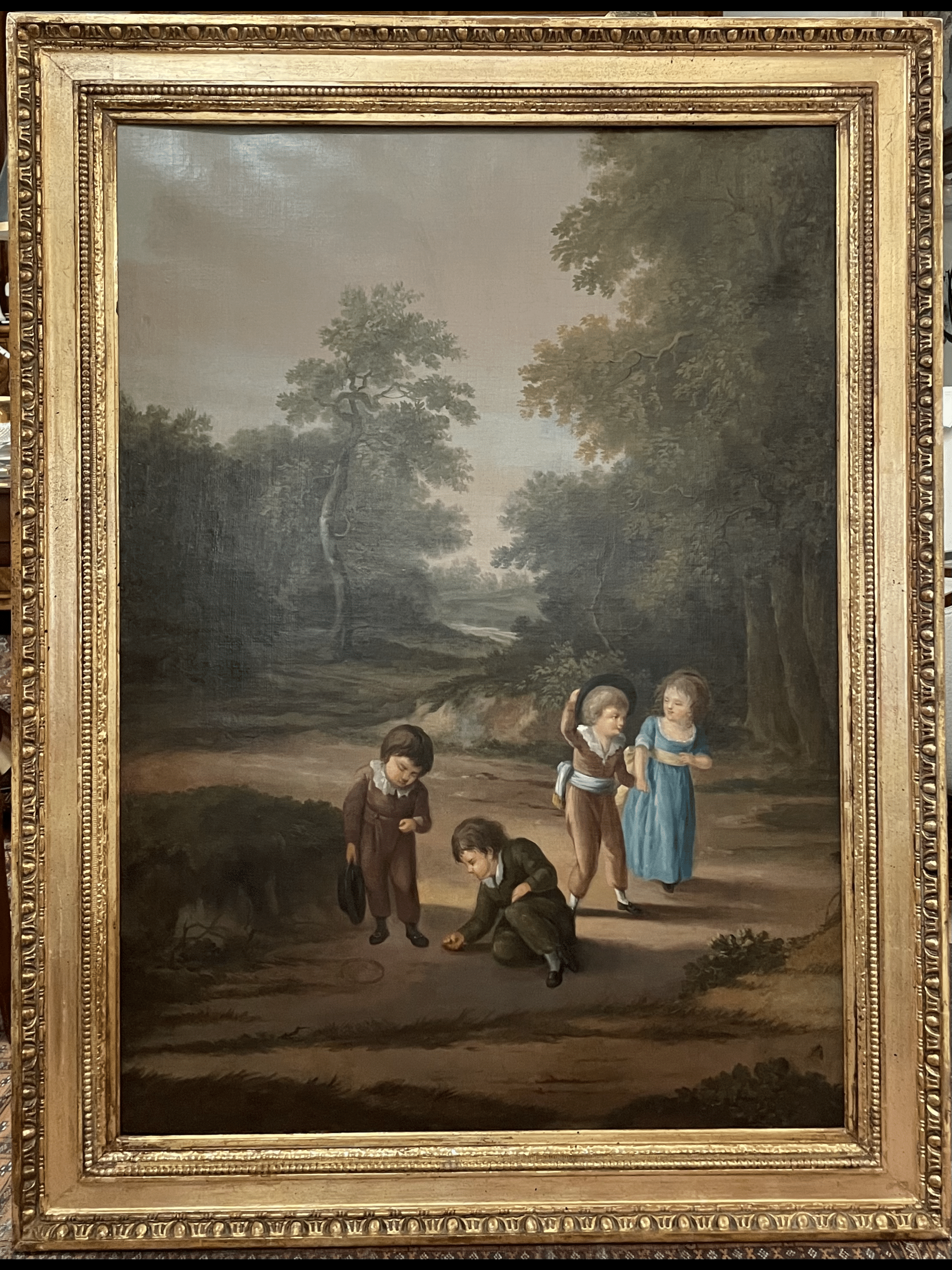 Das Gemälde zeigt eine Gruppe von vier Kindern, die in einer lichten Waldlandschaft spielen. Zwei Jungen im Vordergrund beschäftigen sich mit einem einfach wirkendem Spiel am Boden, während die zwei anderen Kinder, Hand in Hand und leicht zurückversetzt auf dem Weg stehen. Ihre Kleidung lässt auf eine bürgerliche Herkunft schließen. Sie tragen Kleider mit hellen Bändern, Kragen und Halbschuhen. Die Szene ist in sanfte, natürliche Farben getaucht. Die Haltung der Kinder vermittelt Lebendigkeit. Für die Zeit des 18. Jhd. ist es ungewöhnlich das Kinder beim zwanglosen Spielen gemalt wurden.