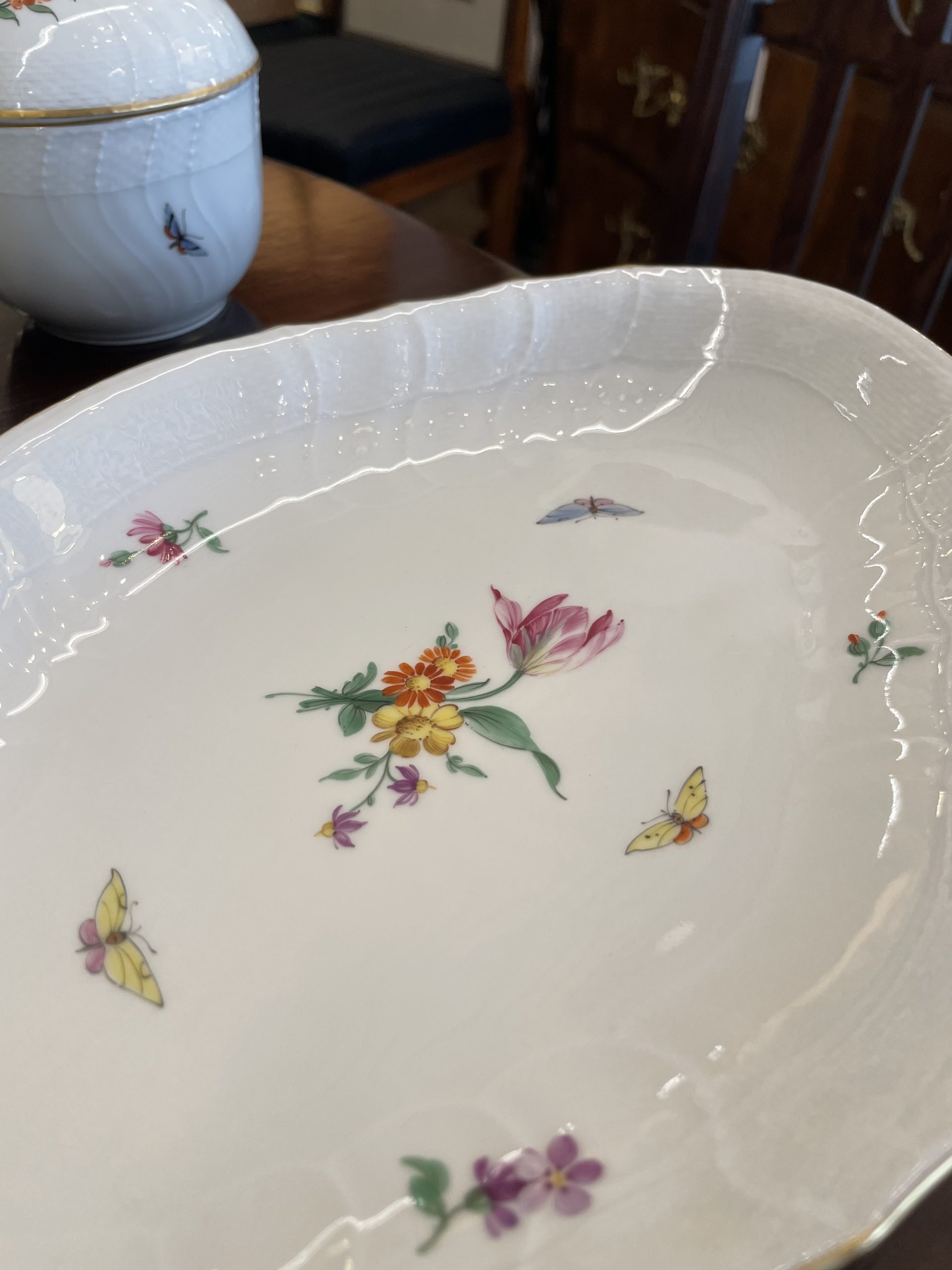 Zwei Kuchenplatten, eine Konfektschale rund, eine Anbietschale oval, zwei Kan- nen (Kaffee und Mokka), ein Milchkännchen, 14 Tassen, 12 Untertassen, zwei Zuckerdosen, 12 Kuchenteller, 9 Anbietteller