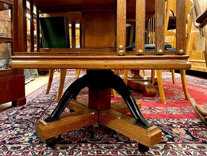 Restauriertes drehbares „revolving bookcase“ aus England, ca. 1920, außergewöhnlich groß, aus Eichenholz massiv, aber filigran gearbeitet mit umrandeten lackierten Holzböden und polierten Messingkappen, Drehkreuz mit schmiedeeiserner Halterung und metallenen Rollen