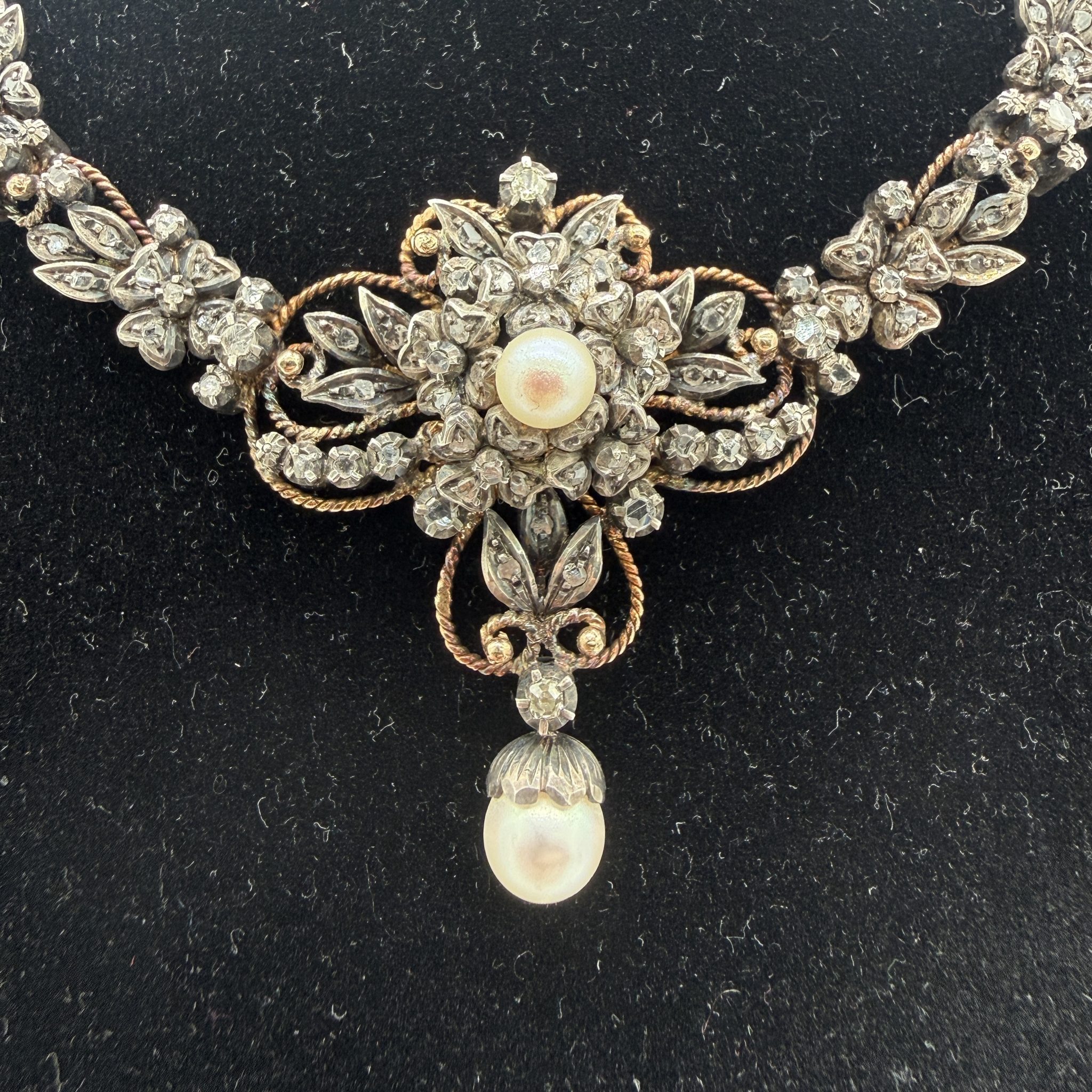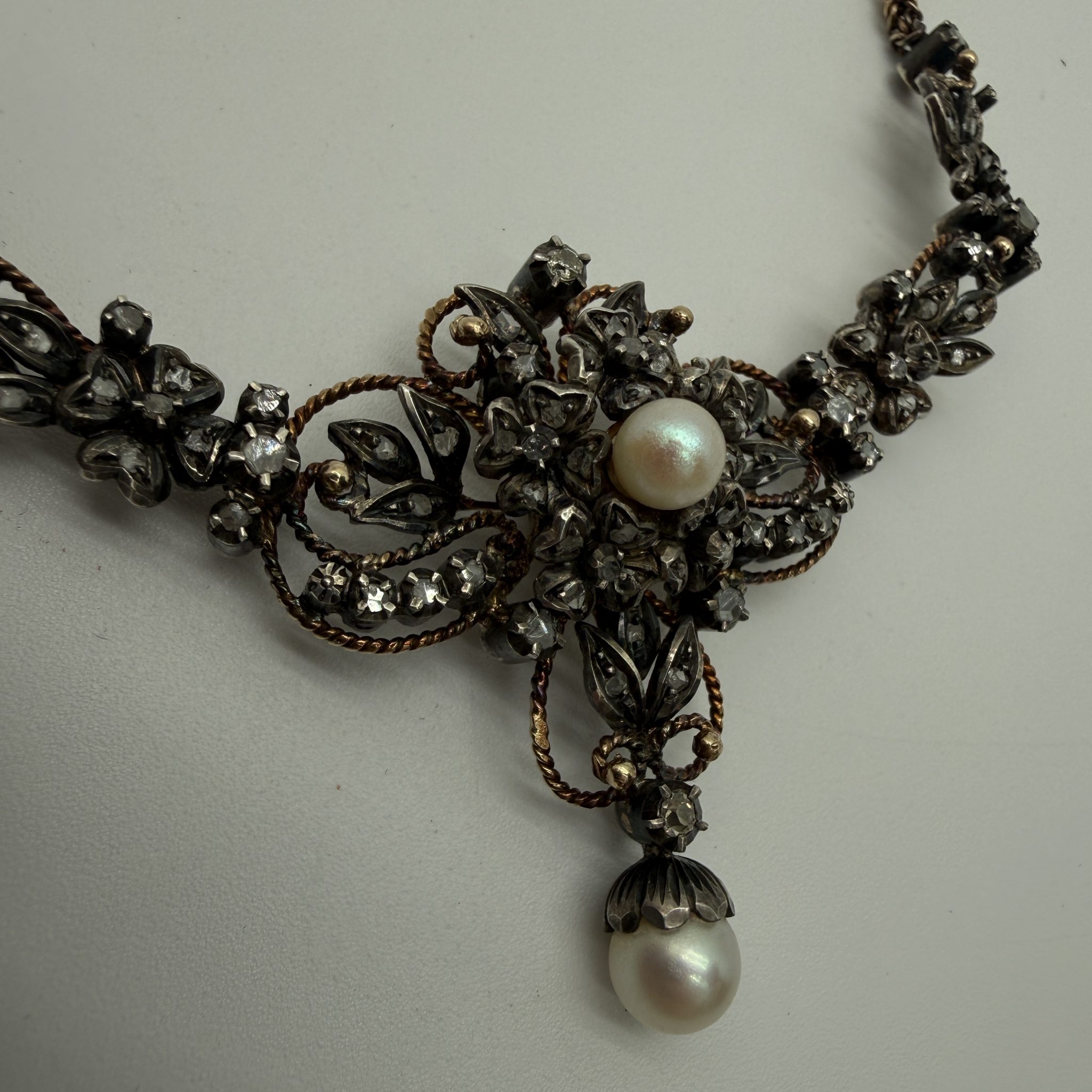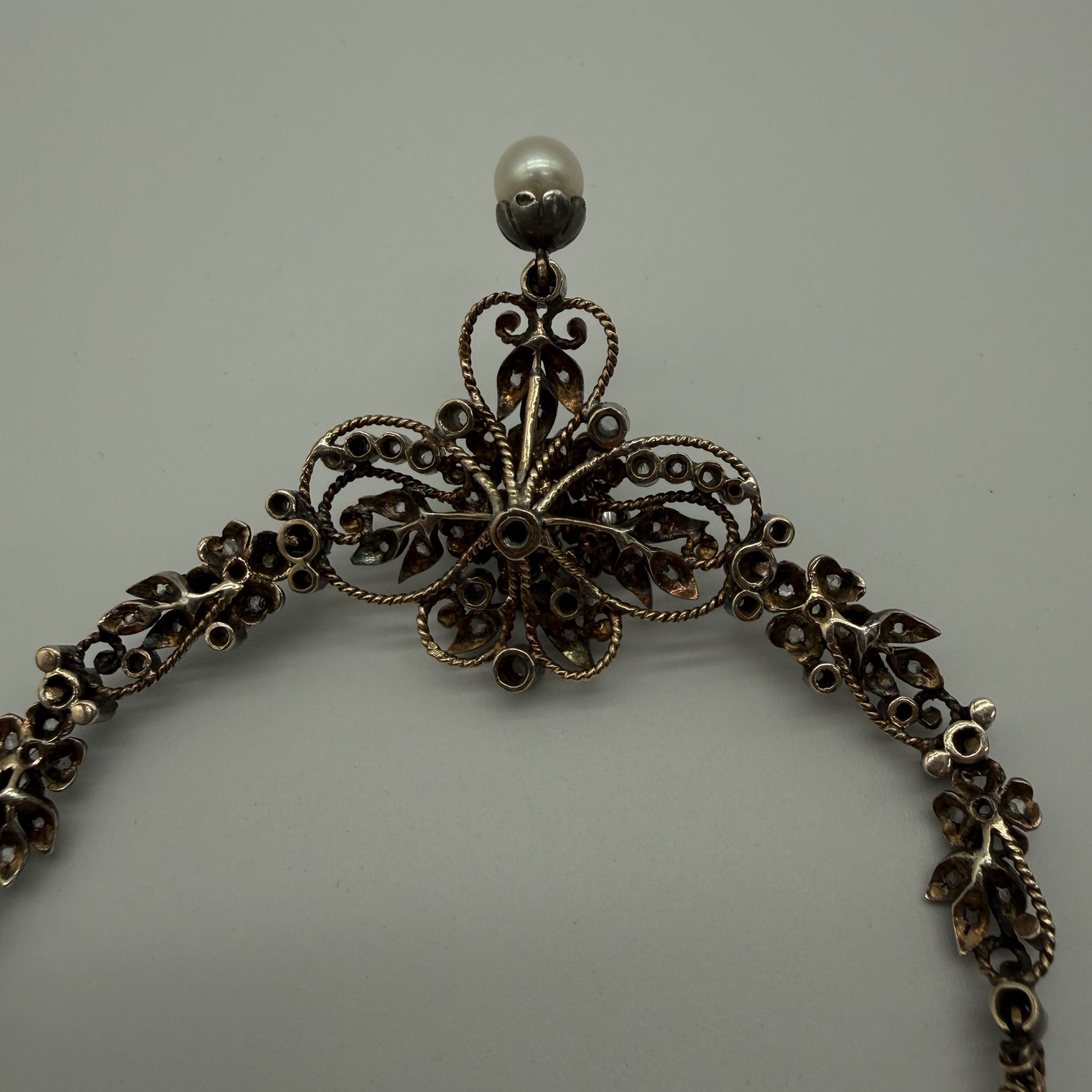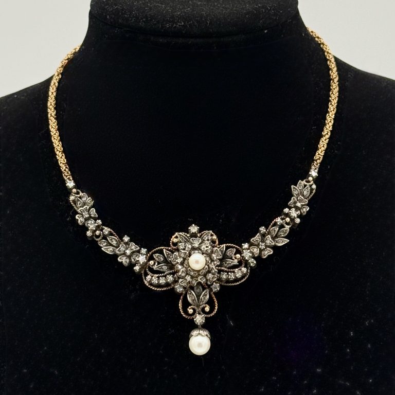 Material: Kette 750er Gold mit Kastenschloss / Diamant Rosen in Silber gefasst / 2 Perlen